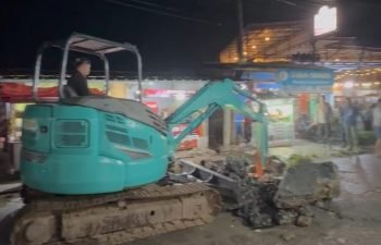 Alat berat itu digunakan untuk membongkar cor beton dan membersihkan saluran agar air bisa kembali mengalir.