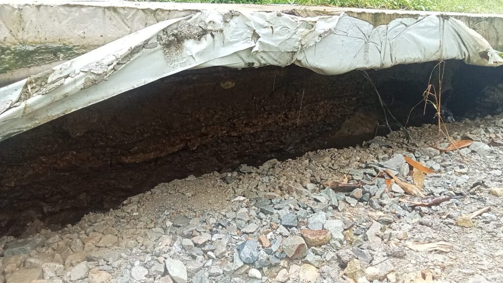 Material terlihat mudah terkelupas, agregat tampak kasar dan tidak menyatu sempurna, serta struktur TPT diduga tidak didukung pondasi dan pemadatan yang memadai.