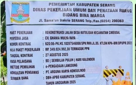 Proyek ini diketahui dikerjakan oleh CV Ghania Mulya Raya, dengan nilai kontrak sebesar Rp349.024.992,30 yang bersumber dari DBH-APBD Kabupaten Serang Tahun Anggaran 2025, dan berada di bawah pengelolaan Dinas Pekerjaan Umum dan Penataan Ruang (DPUPR) Kabupaten Serang, Bidang Bina Marga.