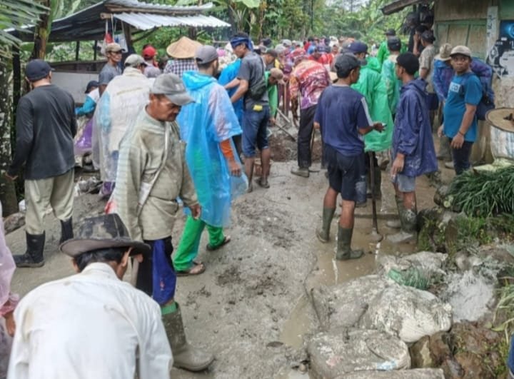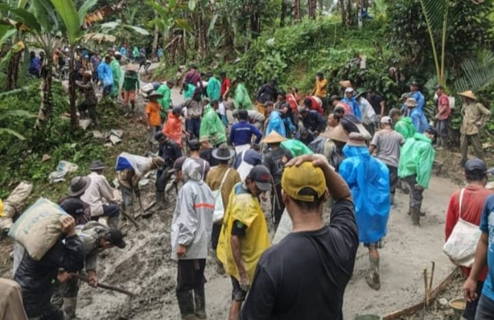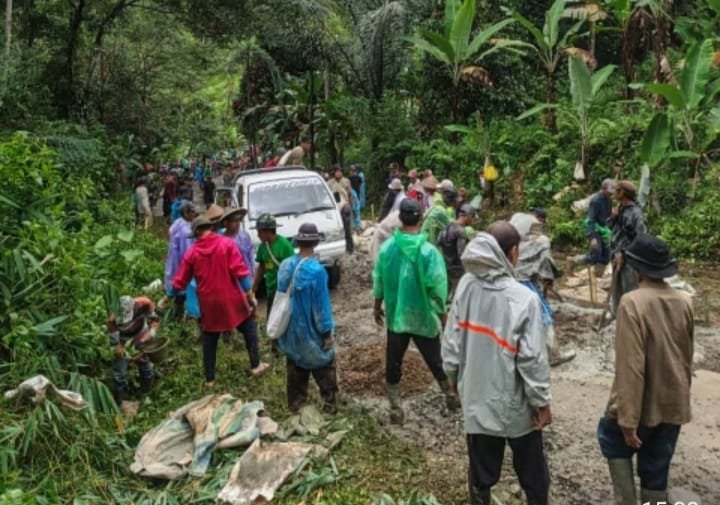 Dalam kondisi jalan yang berlumpur dan cuaca yang kurang bersahabat, warga tetap bahu-membahu mengangkut material, mengaduk semen, hingga melakukan pengecoran jalan secara manual.