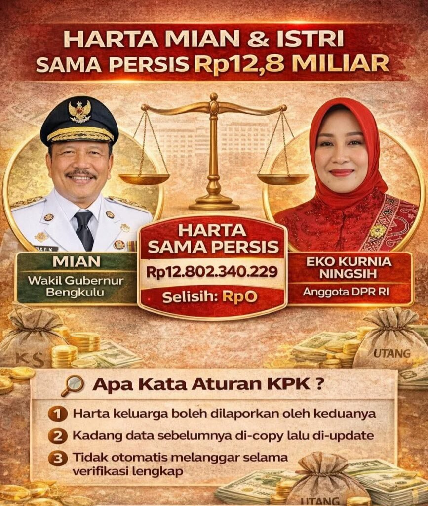 Bengkulu – FaktaDataNews 》Dua tokoh publik asal Bengkulu, yakni Mian dan istrinya Eko Kurnia Ningsih, tercatat memiliki total harta kekayaan dengan nilai yang sama berdasarkan Laporan Harta Kekayaan Penyelenggara Negara (LHKPN) terbaru.