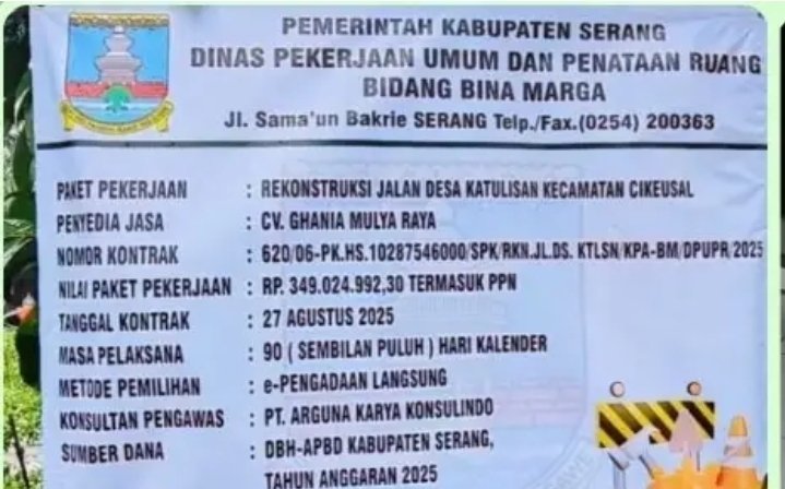Berdasarkan papan proyek, pekerjaan ini berada di bawah naungan Dinas Pekerjaan Umum dan Penataan Ruang Kabupaten Serang melalui Bidang Bina Marga, dengan pelaksana CV. Ghania Mulya Raya serta konsultan pengawas PT. Arguna Karya Konsulindo, dengan nilai anggaran sekitar Rp349 juta dari APBD 2025.