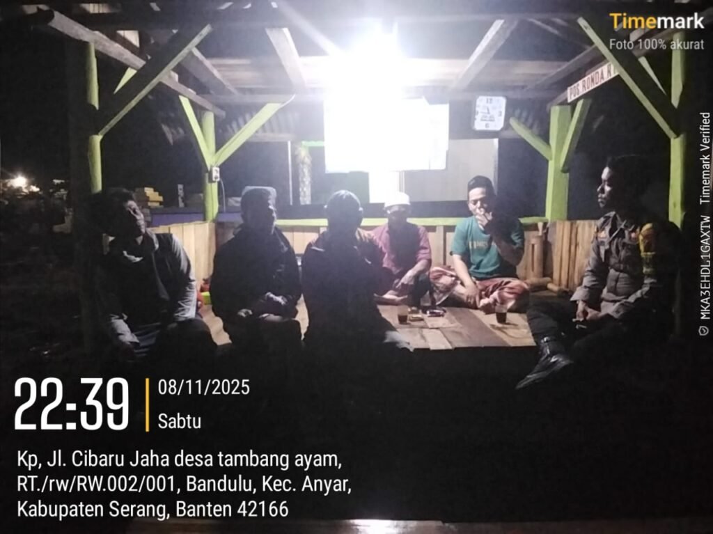 Anyar / Fakta Data News / 8 November 2025 — Dalam upaya menjaga situasi keamanan dan ketertiban masyarakat (Kamtibmas) tetap kondusif, Kapolsek Anyar bersama Bhabinkamtibmas melaksanakan kegiatan monitoring Poskamling di wilayah Desa Tambang Ayam, Kecamatan Anyar, Sabtu malam (8/11/2025) sekitar pukul 22.30 WIB.
