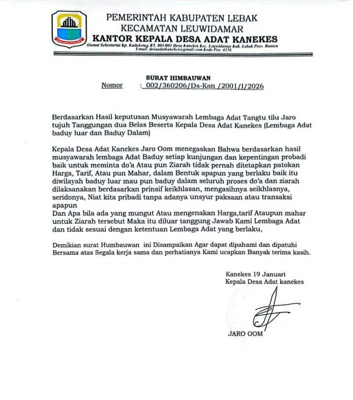 Lebak, Banten – FaktaDataNews 》Kepala Desa Adat Kanekes Jaro Oom melalui surat himbauan bernomor 002/360206/Ds-Kan/2001/I/2026 yang dikeluarkan pada Senin (19/1/2026).