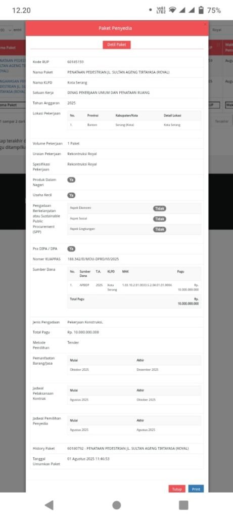 Proyek ini juga diharapkan dapat menjadi ikon baru Kota Serang sebagai pusat pemerintahan provinsi Dengan Pagu Paket dan Anggaran PENATAAN PEDESTRIAN JL. SULTAN AGENG TIRTAYASA (ROYAL) 10.000.000.000 Bersumber dari Dana APBDP August 2025 Namun, Tubagus Aji Fatuloh meminta klarifikasi lebih lanjut dari pihak terkait mengenai penyebab banjir ini dan apakah ada kesalahan dalam proses pembangunan.
