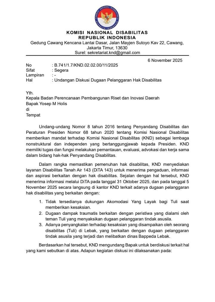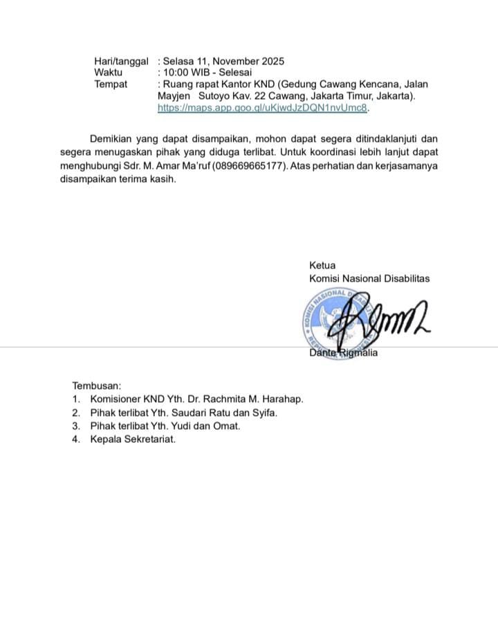 Surat tersebut ditandatangani oleh Ketua KND, Dr. Dante Rigmalia, dan ditembuskan kepada Komisioner KND Dr. Rachmita M. Harahap, pihak keluarga pelapor, serta individu-individu yang diduga terlibat dalam peristiwa awal.Negara Wajib Hadir Lindungi Warga Disabilitas