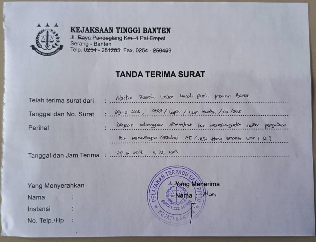 Laporan pengaduan (Lapdu) tersebut diserahkan langsung oleh Ketua LMPI Mada Banten, Jhoner Sihite, P, didampingi Sekretaris Daerah LMPI Banten, Hasan Ashari, melalui Pelayanan Terpadu Satu Pintu (PTSP) Kejati Banten dan telah diterima secara resmi sebagaimana tercantum dalam tanda terima surat.