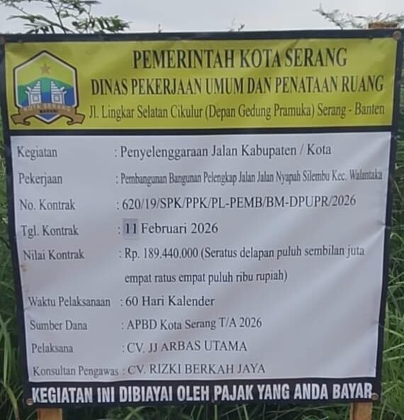Merujuk pada papan informasi proyek di lokasi, kegiatan “Pembangunan Bangunan Pelengkap Jalan Jalan Nyapah Silembu Kec. Walantaka ini menelan anggaran yang tidak sedikit, yakni Rp 189.440.000 (Seratus delapan puluh sembilan juta empat ratus empat puluh ribu rupiah) yang bersumber dari APBD Kota Serang T/A 2026.