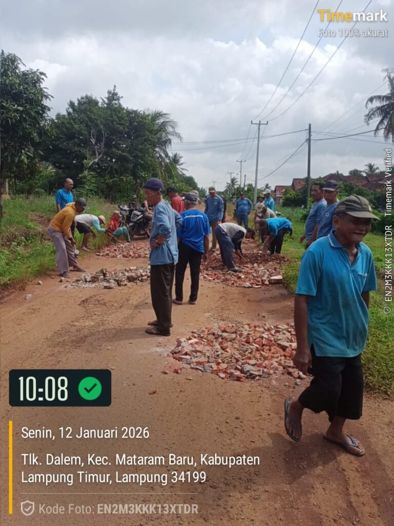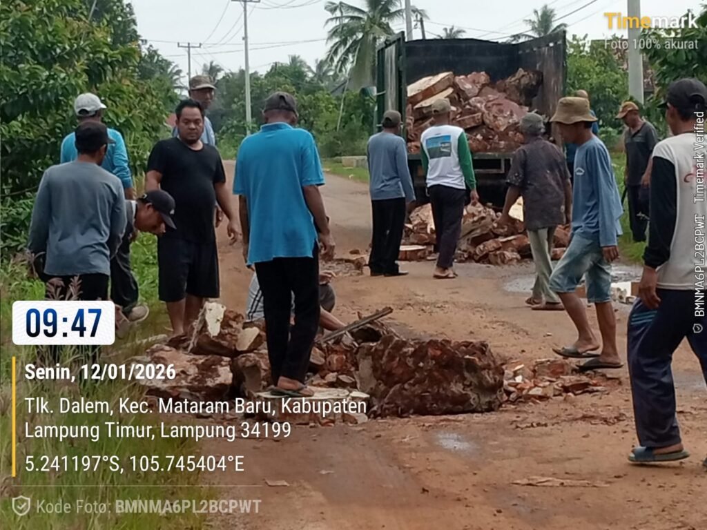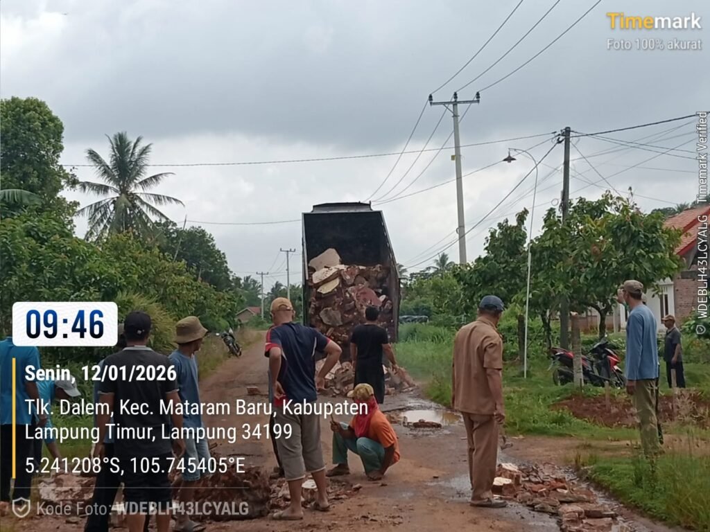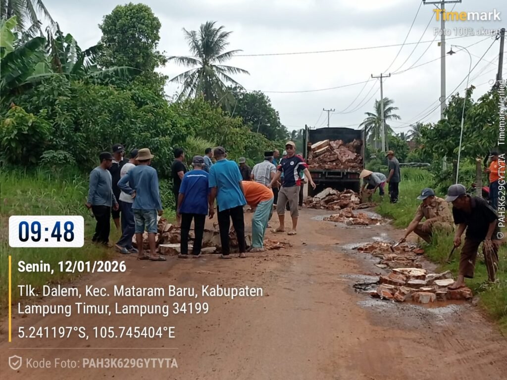 LAMPUNG TIMUR – FaktaDataNews 》Tak ingin terus berpangku tangan melihat kondisi jalan yang rusak parah, ratusan warga Dusun 2 dan Dusun 3 Desa Teluk Dalem, Kecamatan Mataram Baru, Kabupaten Lampung Timur, turun langsung melakukan penimbunan jalan berlubang secara swadaya.