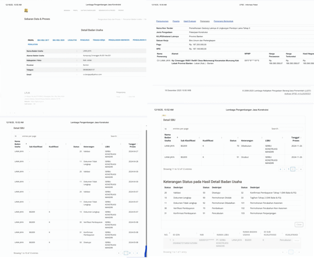 Dalam surat bernomor 000.3.1/5/Umum/2026 tertanggal 05 Januari 2026, yang ditandatangani Kepala Biro Umum Setda Provinsi Banten, disebutkan bahwa berdasarkan hasil telaah dan klarifikasi kepada Pejabat Pengadaan serta pihak penyedia (Direktur CV Lana Jaya), diperoleh keterangan bahwa Sertifikat Badan Usaha (SBU) masih aktif dan berlaku, dengan dasar bukti fisik SBU terlampir.