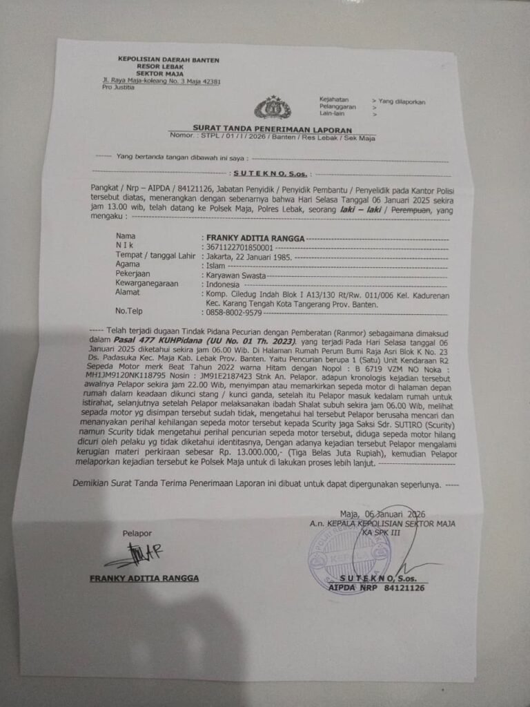 Lebak, Banten – FaktaDataNews 》12 Januari 2026. Kejadian memilukan menimpa salah satu anggota Laskar Merah Putih Indonesia (LMPI) Provinsi Banten, Franky Aditia Rangga, yang menjadi korban pencurian kendaraan bermotor di Perumahan Bumi Raja Asri, Kecamatan Maja, Kabupaten Lebak.