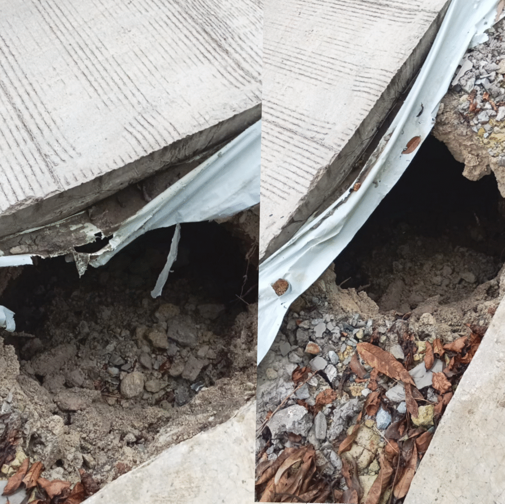 Kondisi di lokasi memperlihatkan tanah gembur dan rongga besar di bawah permukaan beton—indikasi yang sulit dibantah.