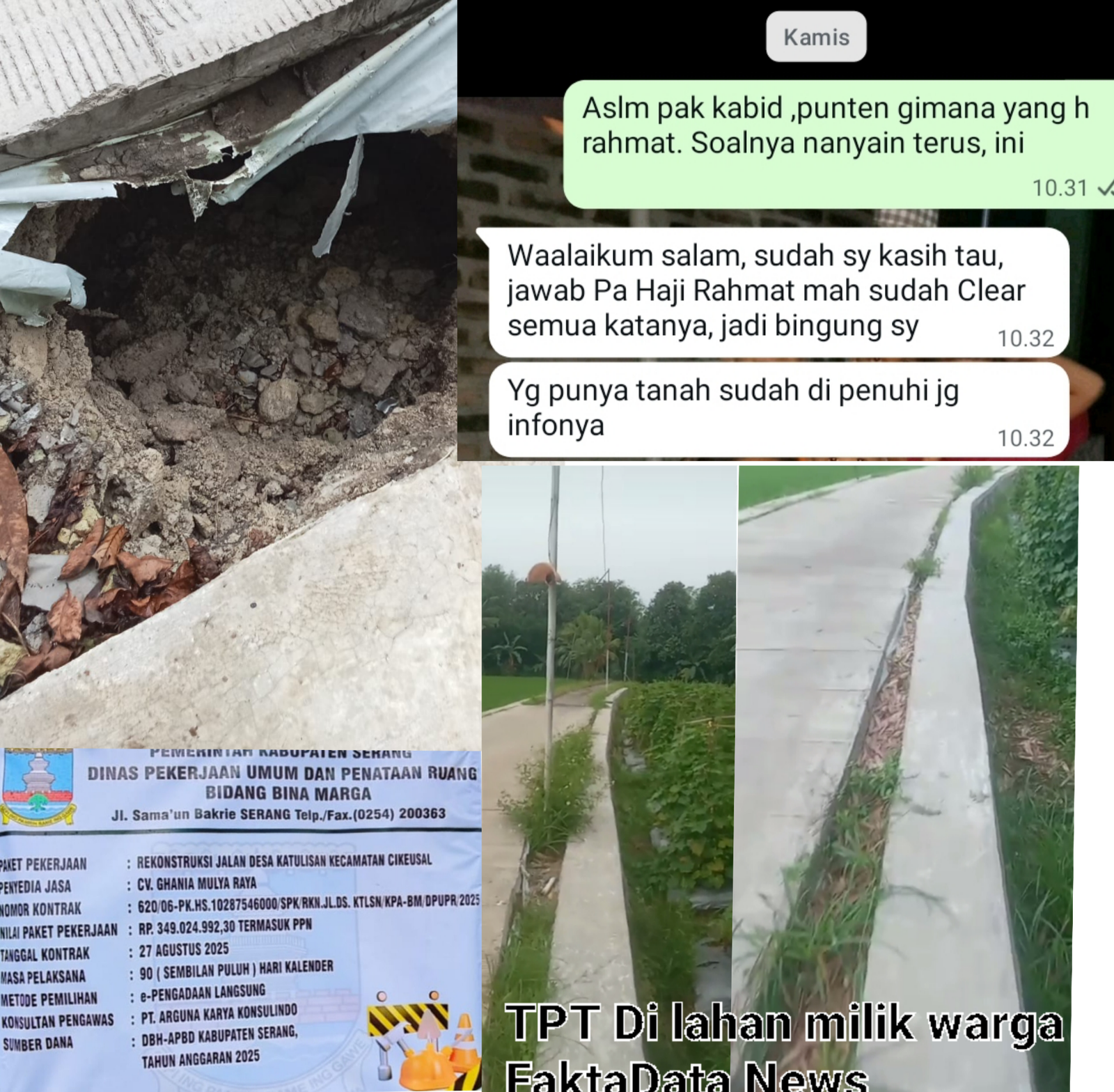 Ketika FaktaData News mengonfirmasi, Kabid PUPR Kabupaten Serang menyampaikan bahwa semua persoalan sudah “clear”, mengutip informasi dari pihak kontraktor, Haji Rahmat, yang disebut menyatakan bahwa pemilik lahan sudah dibereskan.