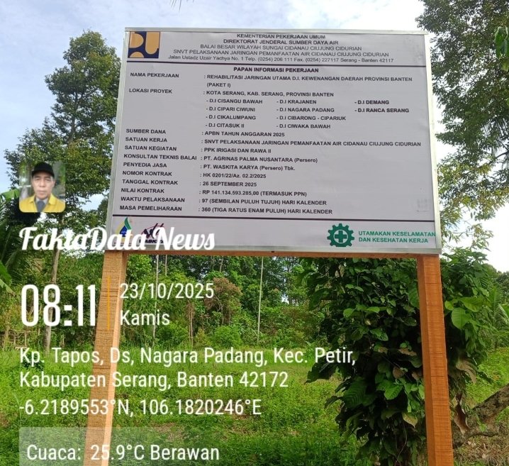 Serang,23 Oktober 2025 — FaktaData News Proyek rehabilitasi jaringan irigasi senilai Rp141 miliar di bawah Balai Besar Wilayah Sungai Cidanau–Ciujung–Cidurian (BBWSC3) kembali menuai kritik tajam.