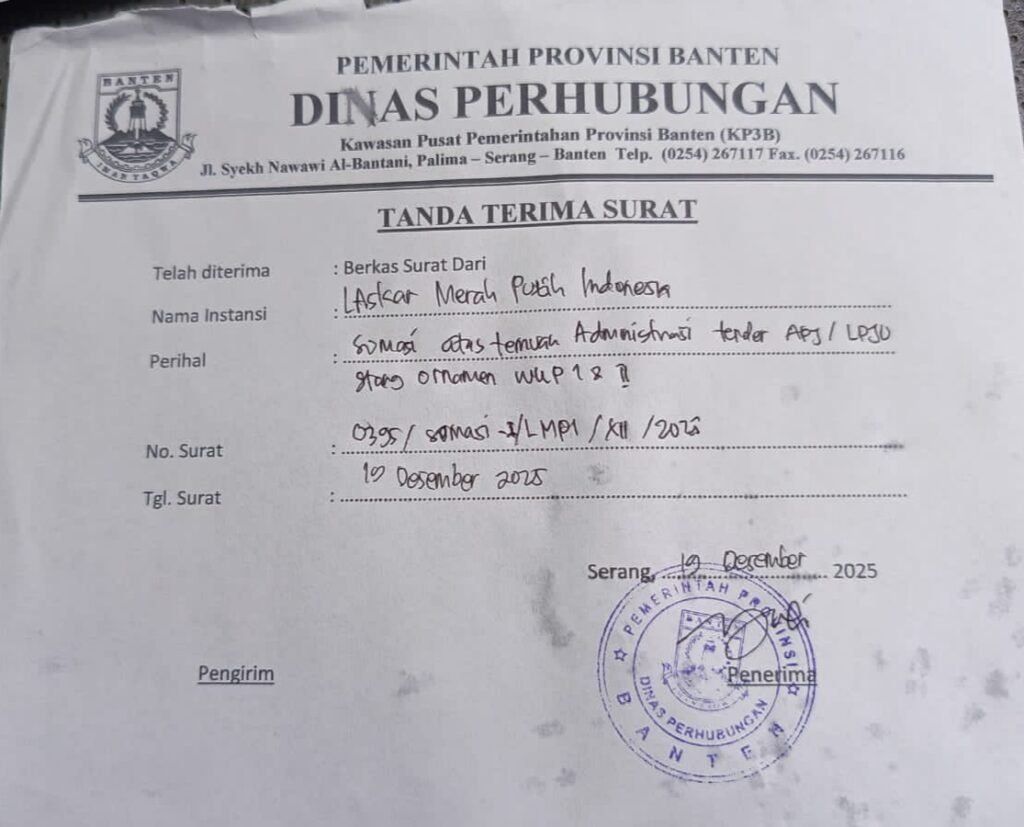 Serang — FaktaDataNews 》Laskar Merah Putih Indonesia (LMPI) Markas Daerah (Mada) Banten resmi menyatakan SOMASI PERANG terhadap Dinas Perhubungan Provinsi Banten, Jum’at (19 – 12 – 2025 ).